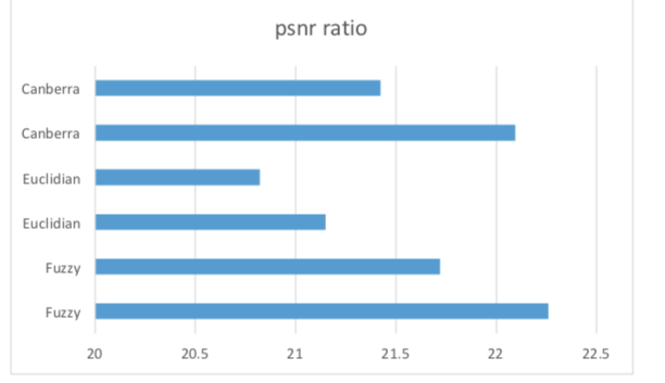 Fuzzy metric performed better in noise reduction whereas the Euclidian metric was faster. The metric Canberra we used gave results faster than fuzzy metric and error less than Euclidian metric. But fuzzy had a problem of leaving few white pixels unidentified and Canberra was ineffective with contrasting colours. So taking all these parameters into account, we can conclude that Euclidian metric is best for most cases.